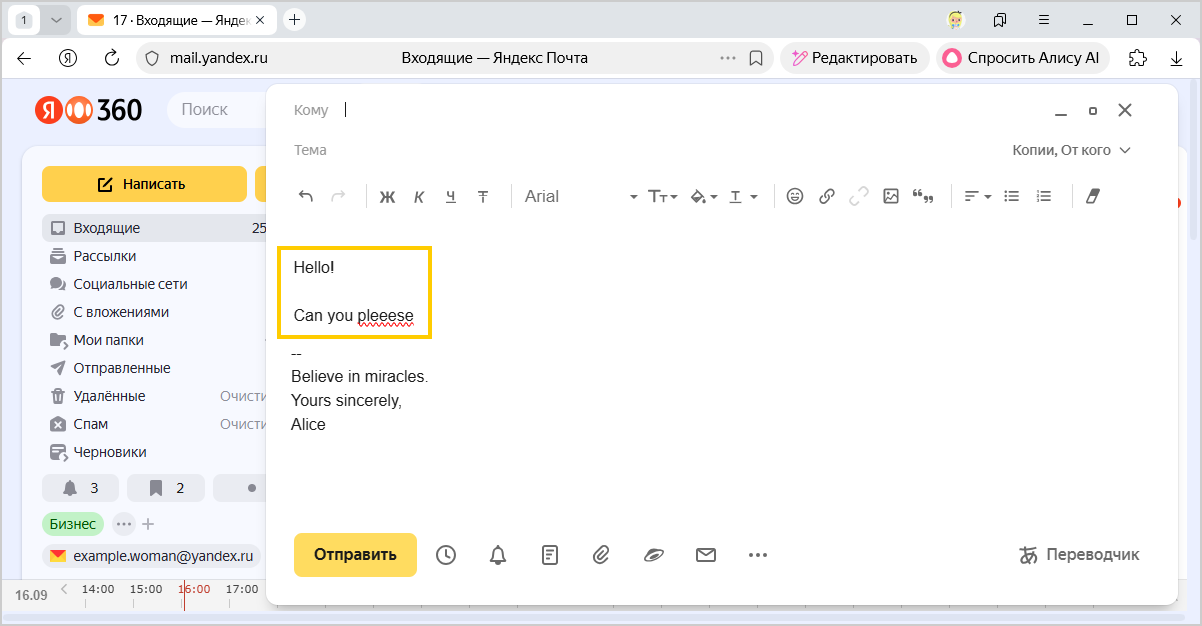 Когда вы вводите текст, Браузер подчеркивает незнакомые слова. Если вы уверены в написании подчеркнутого слова, нажмите на него правой кнопкой мыши и выберите Добавить в словарь.