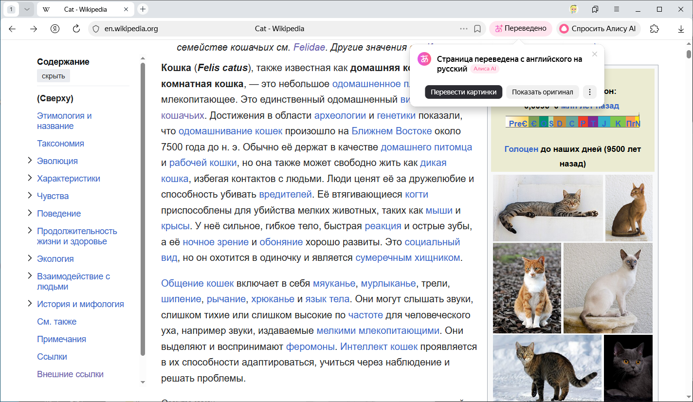 Браузер предложит перевести страницу, если ее язык отличается от языка интерфейса. Вызвать переводчик или перевести отдельные слова, картинки или видео можно через контекстное меню.