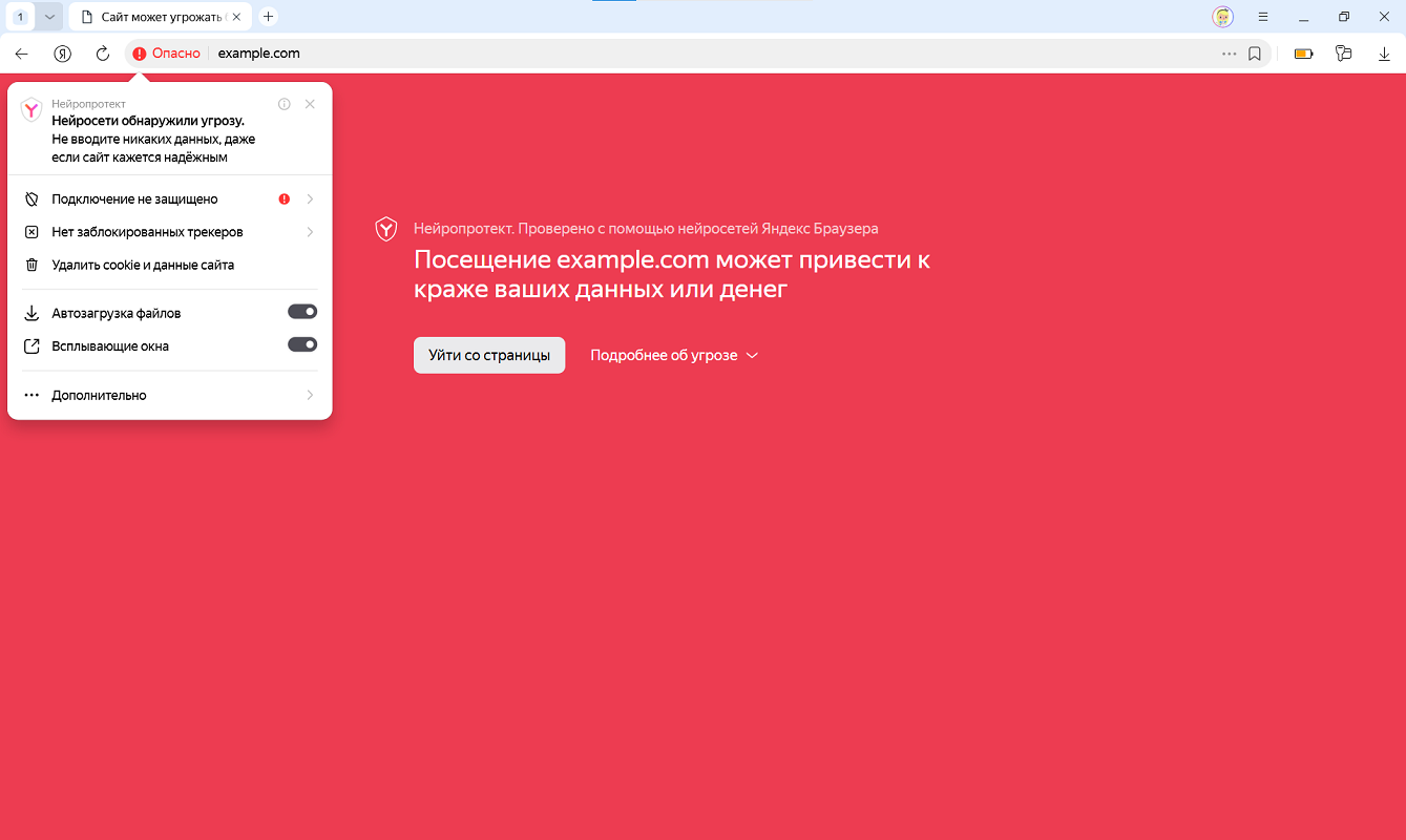При вводе номера платежной карты Браузер может вывести на экран предупреждение, что присутствует явная угроза кражи данных или проблема с безопасностью. В этом случае в Умной строке появляется значок Опасный сайт и открывается окно с предупреждением.
