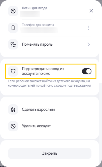 Чтобы ребенок не смог выйти из аккаунта самостоятельно, настройте подтверждение выхода по смс. Если ребенок захочет выйти из детского аккаунта, на номер родителей придет номер с кодом подтверждения.