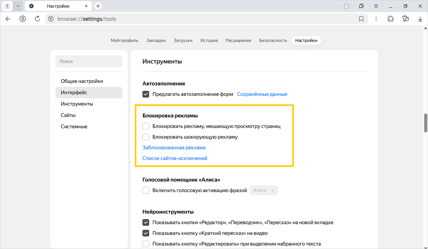 Яндекс Браузер фильтрует форматы мешающей рекламы, чтобы вы могли отключить их в настройках.