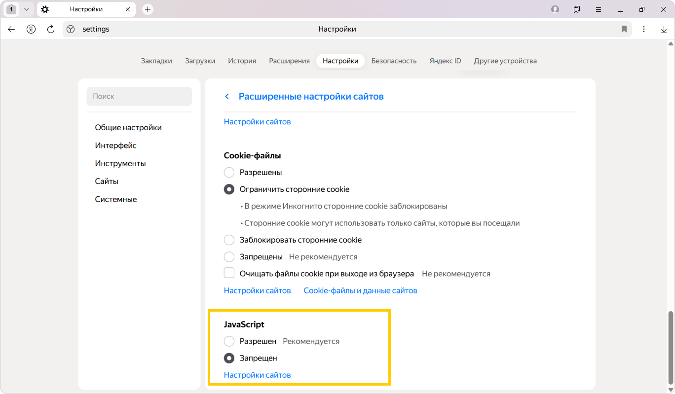 Прокрутите страницу вниз и нажмите Расширенные настройки сайтов.