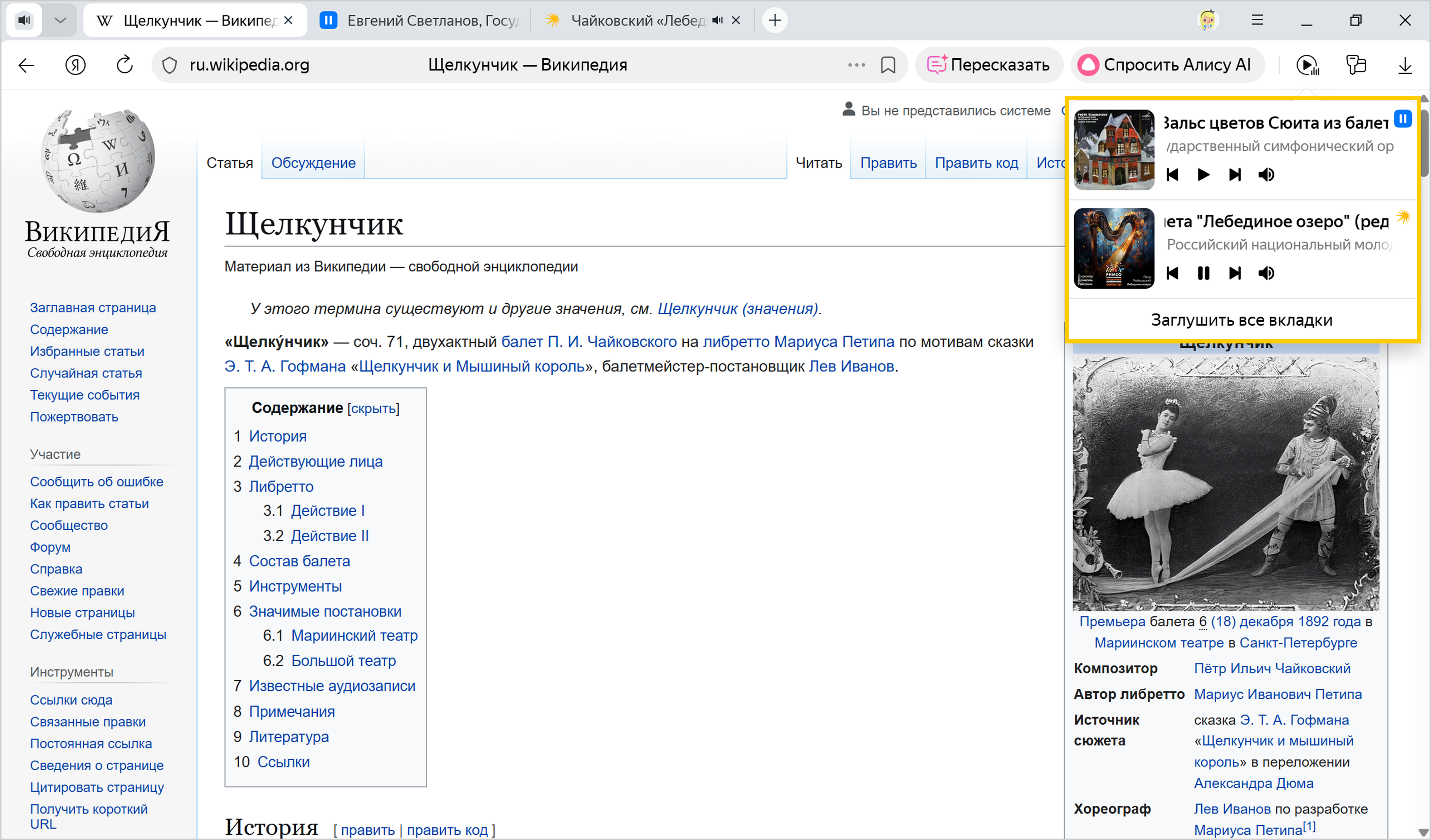 В Браузере можно одновременно просматривать сайт и слушать музыку, запущенную на другой вкладке. Чтобы не переключаться между вкладками, справа от Умной строки нажмите значок Музыка. В появившейся панели управления можно поставить трек на паузу или запустить заново, переключиться на предыдущий или следующий трек в плейлисте. Если вы запустили музыку на нескольких вкладках, на панели отображаются все треки, и вы можете легко переключаться между ними.