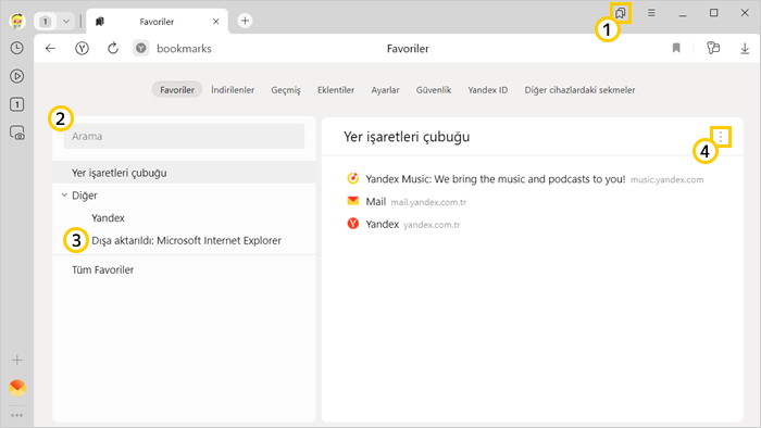 Yandex Browser’ı farklı cihazlarda eşitlediyseniz sol menüde cihaz adıyla klasörler görünecektir (ör. Akıllı Telefon veya Tablet). Ayrıntılı bilgi için Favorilerin eşitlenmesi bölümünü okuyun.
