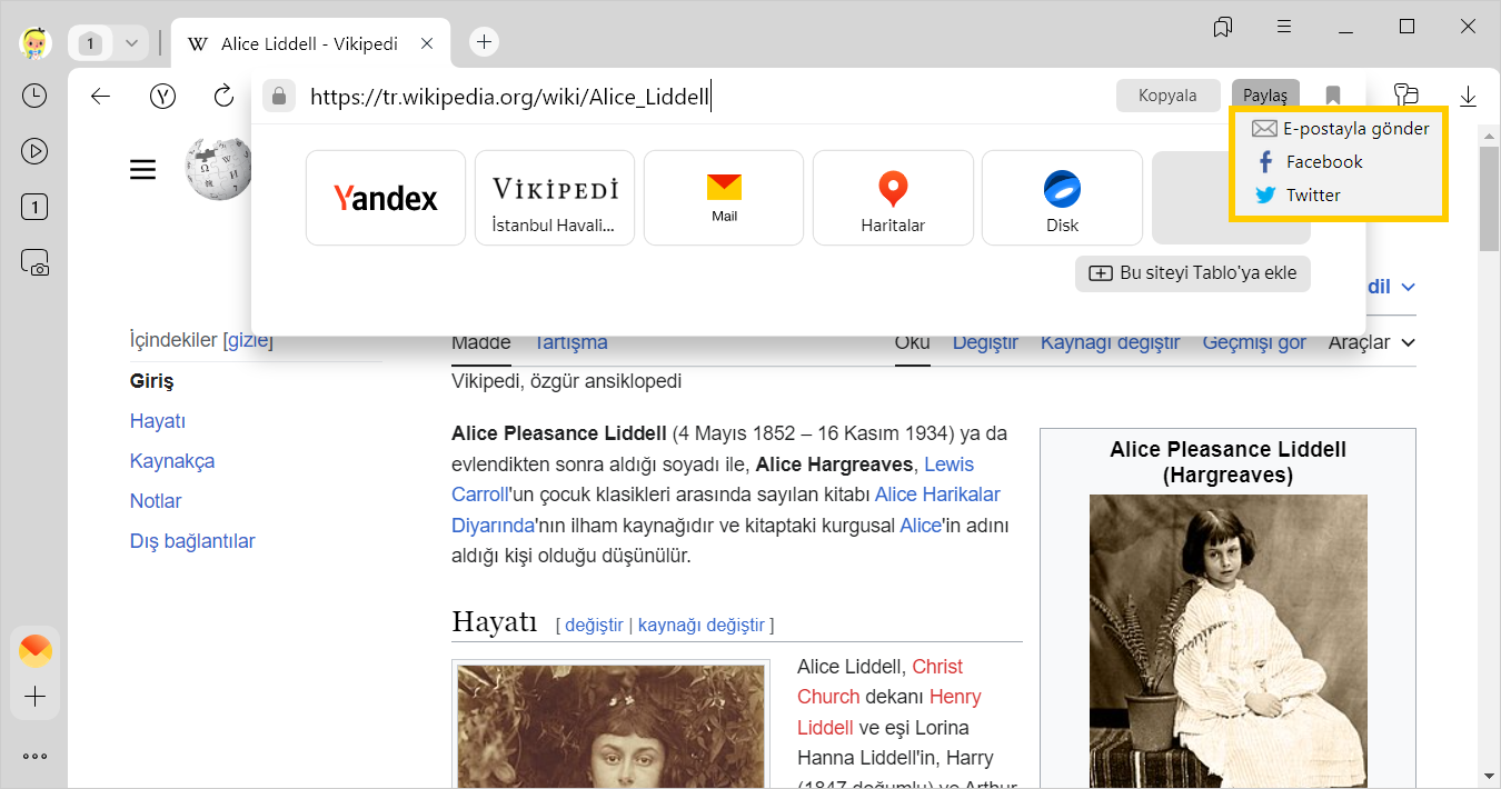 Sayfa bağlantısının kopyalanması veya paylaşılması