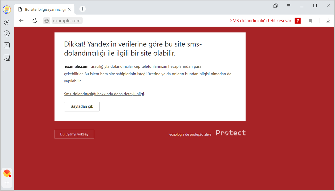 Siteye mobil telefon üzerinden kullanıcı girişi yapıldığında veya mobil telefona SMS mesajı gönderildiğinde dolandırıcılık girişimlerine rastlanabilir. Örneğin, kullanıcı yaptığı ödeme karşılığında aradığı hizmeti almayabilir veya mobil telefon hesabından sürekli para çekilmeye başlayabilir. Protect adı verilen kapsamlı koruma sistemi sayesinde Yandex Browser dolandırıcılar tarafından kullanılabilen sitelerin izini sürer ve bunları engeller.