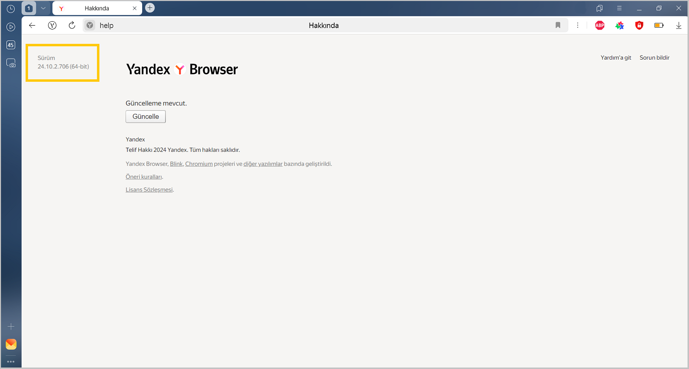 → Yardım → Yandex Browser hakkında ögesine tıklayın.