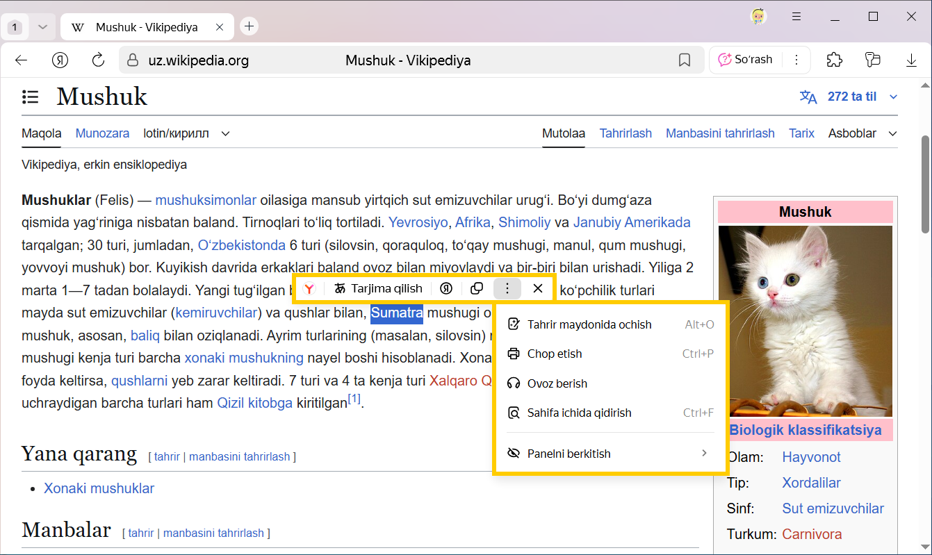 Uskunalar paneli belgilangan parchani nusxalash, uni Yandexda topish, tarjima qilish, chop etish, ovoz berish va boshqalarga yordam beradi. Butun vositalar roʻyxatini ochish uchun tugmasini bosing.