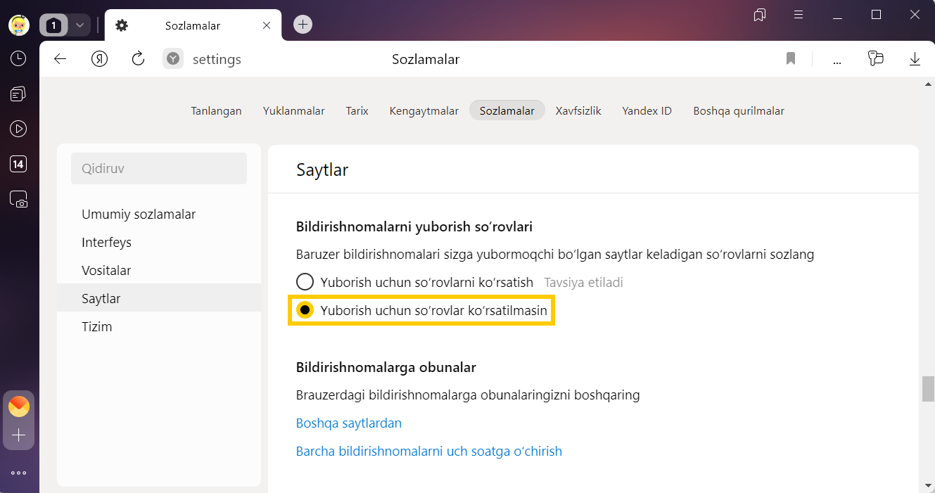 Sozlamalarni saqlash uchun Yandex ID bilan kiring. Agar tizimga kirmasangiz bildirishnomalar sozlamalari Brauzer cookie-fayllarida saqlanadi va birinchi tozalashda oʻchiriladi.