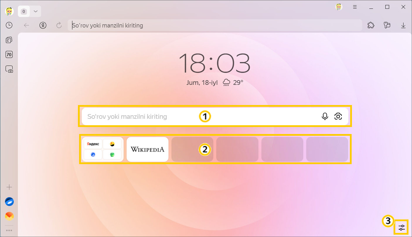 belgisini bosganingizda, Yandex Brauzer yangi sahifa ekrani ochiladi. Bu yerda barcha tegishli maʼlumotlar jamlangan. Yangi varaqning tashqi shakli va mundarijasini sozlash mumkin.