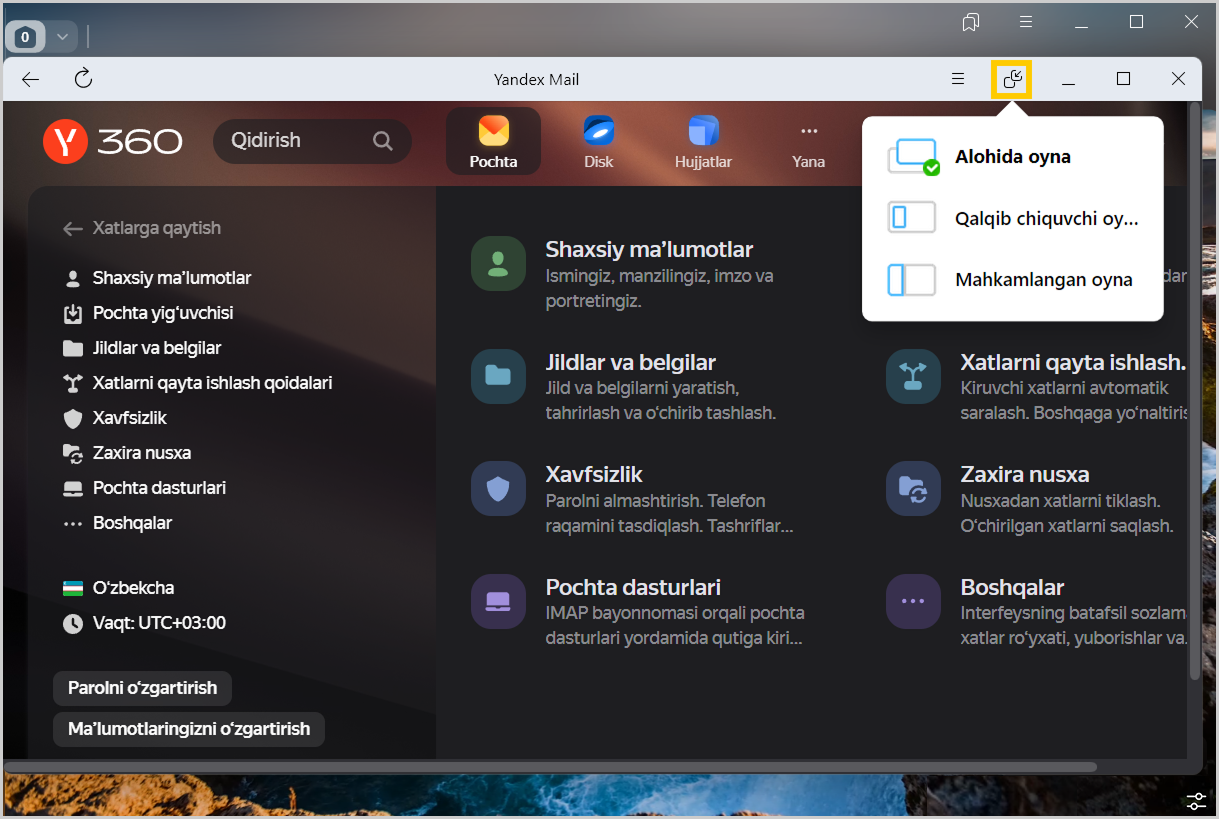 Bu rejimda siz asosiy oyna bilan ishlayotganda yana bitta xizmatni koʻrishingiz mumkin (chatlar, pochta, onlayn translatsiya).
