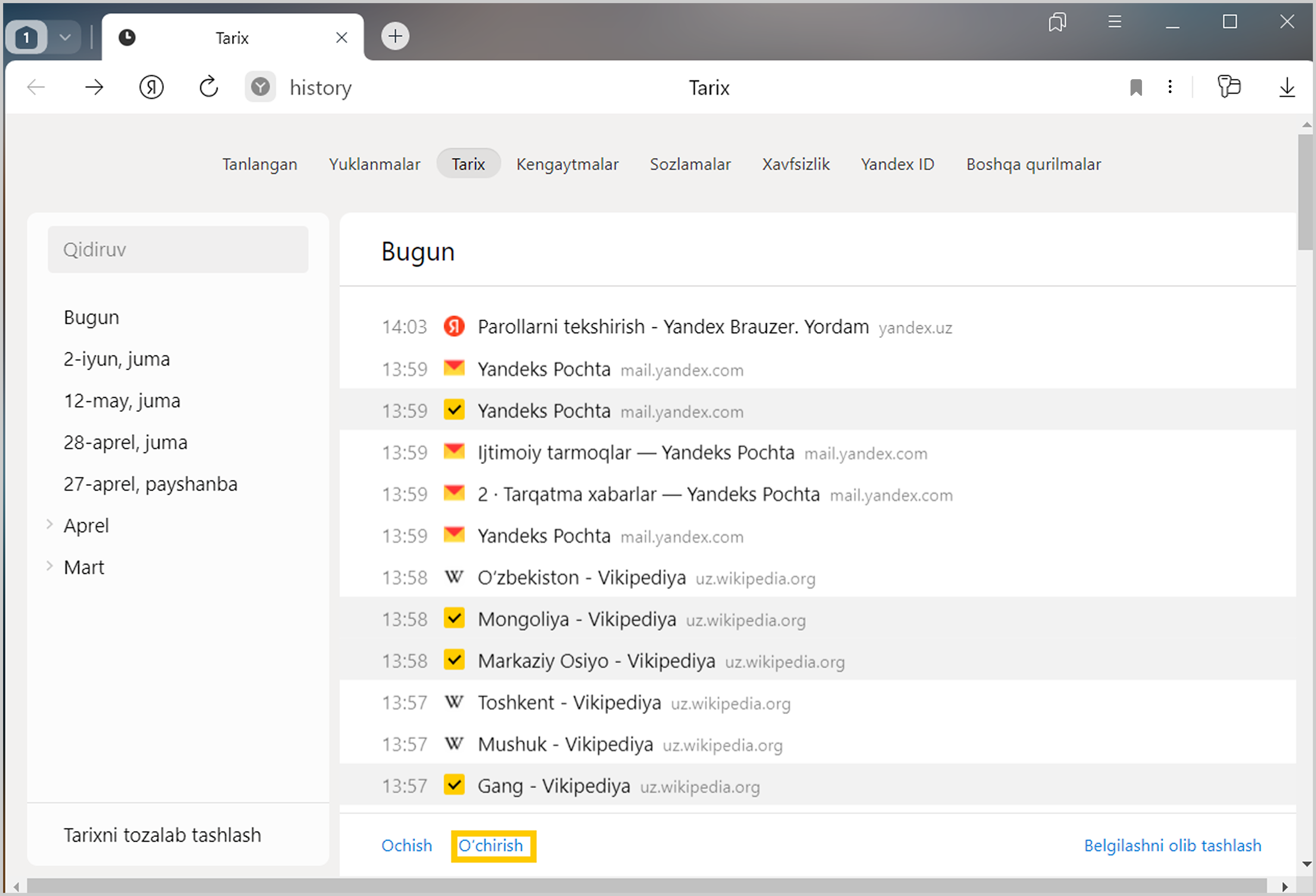Butun tarixni koʻrish uchun  → Tarix → Tarix tugmasini bosing yoki tugmalar Ctrl + H tugmalarini bosing.