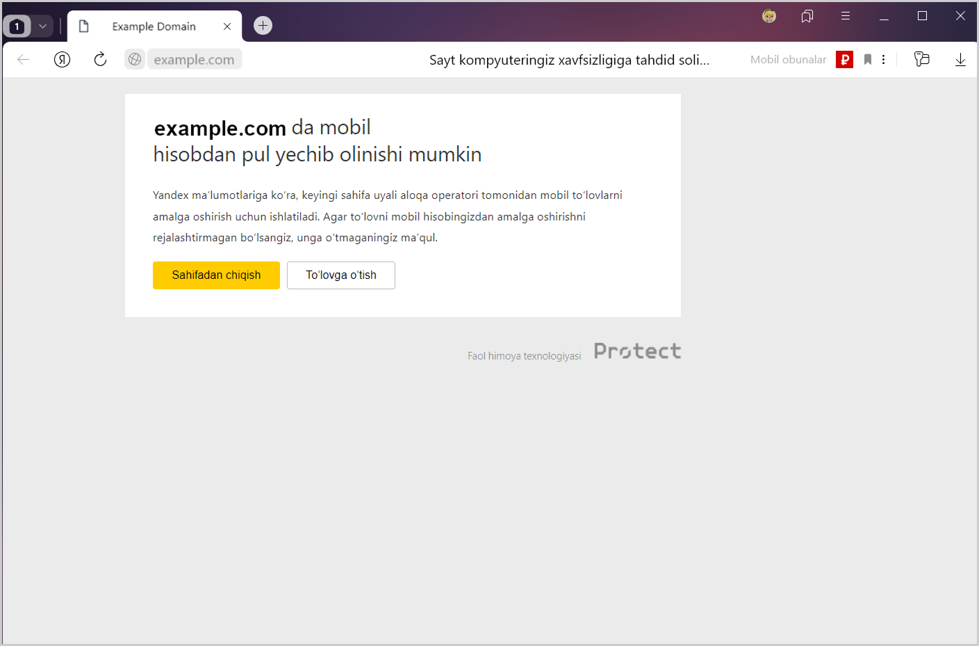 Telefoningiz uchun pulli xizmatga obuna bo‘lish juda oson: sayt sahifasidagi tugmani bossangiz bas. Protect majmuali himoya tizimi doirasida Brauzer sizni pulli obunalar haqida ogohlantiradi, shunda siz ularga faqat kerak bo‘lganda rozi bo‘lasiz.
