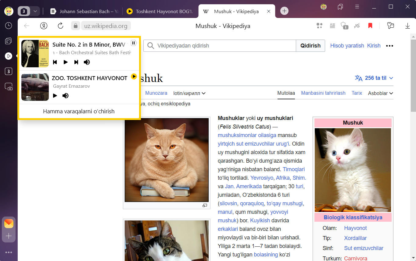 Brauzerda bir vaqtning o‘zida saytni ko‘rish hamda boshqa varaqda ijro etilayotgan musiqani tinglash mumkin. Sahifalar orasida almashmaslik uchun aqlli satrning o‘ng tomonida belgisini bosing.. Ochilgan boshqaruv panelida trekni pauzalash yoki qayta ishga tushirish, pleylistdagi oldingi yoki keyingi trekka o‘tish mumkin. Agar siz musiqani bir nechta yorliqlarda ijro etishni boshlagan bo‘lsangiz, panelda barcha treklar ko‘rsatiladi va siz ularni osongina almashtirishingiz mumkin.