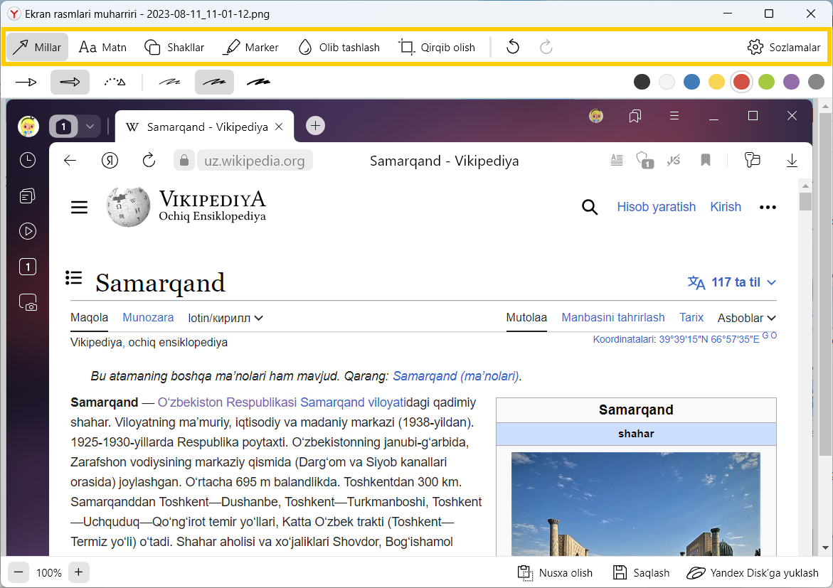 Yandex Brauzerda siz ajratilgan qism yoki butun veb-sahifaning ekran skrinshotlarini yaratishingiz, tasvirni tahrirlash, strelka va yozuvlarni qoʻshishingiz mumkin. Siz skrinshotni doʻstlaringiz yoki texnik yordam xizmatiga yuborishingiz mumkin.