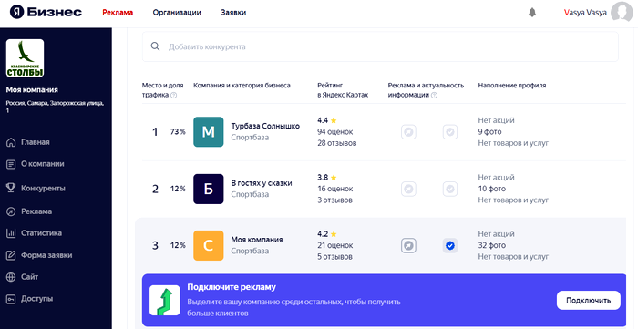 Проверьте актуальность вашего профиля и сравните его с профилями компаний‑конкурентов. Обратите внимание на последние отзывы и оценки.