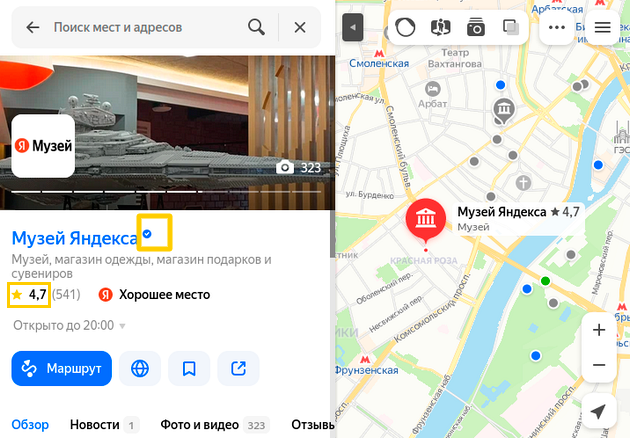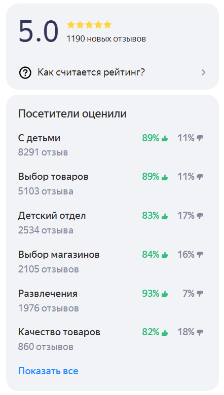 Рейтинг в Картах, Поиске и Яндекс Бизнесе формируется отдельно от других сервисов Яндекса. Значение этого рейтинга не будет совпадать с рейтингами, например, в Маркете или Яндекс Еде.