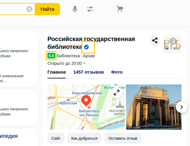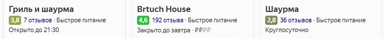 В поисковой выдаче Яндекса в карточке компании можно увидеть цветовую индикацию рейтинга — от более тусклых оттенков к ярко‑зеленому: чем ярче цвет, тем выше рейтинг.