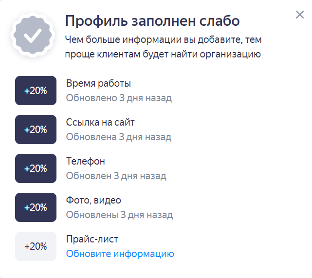 в профиле Яндекс Бизнеса заполнены все обязательные блоки;
