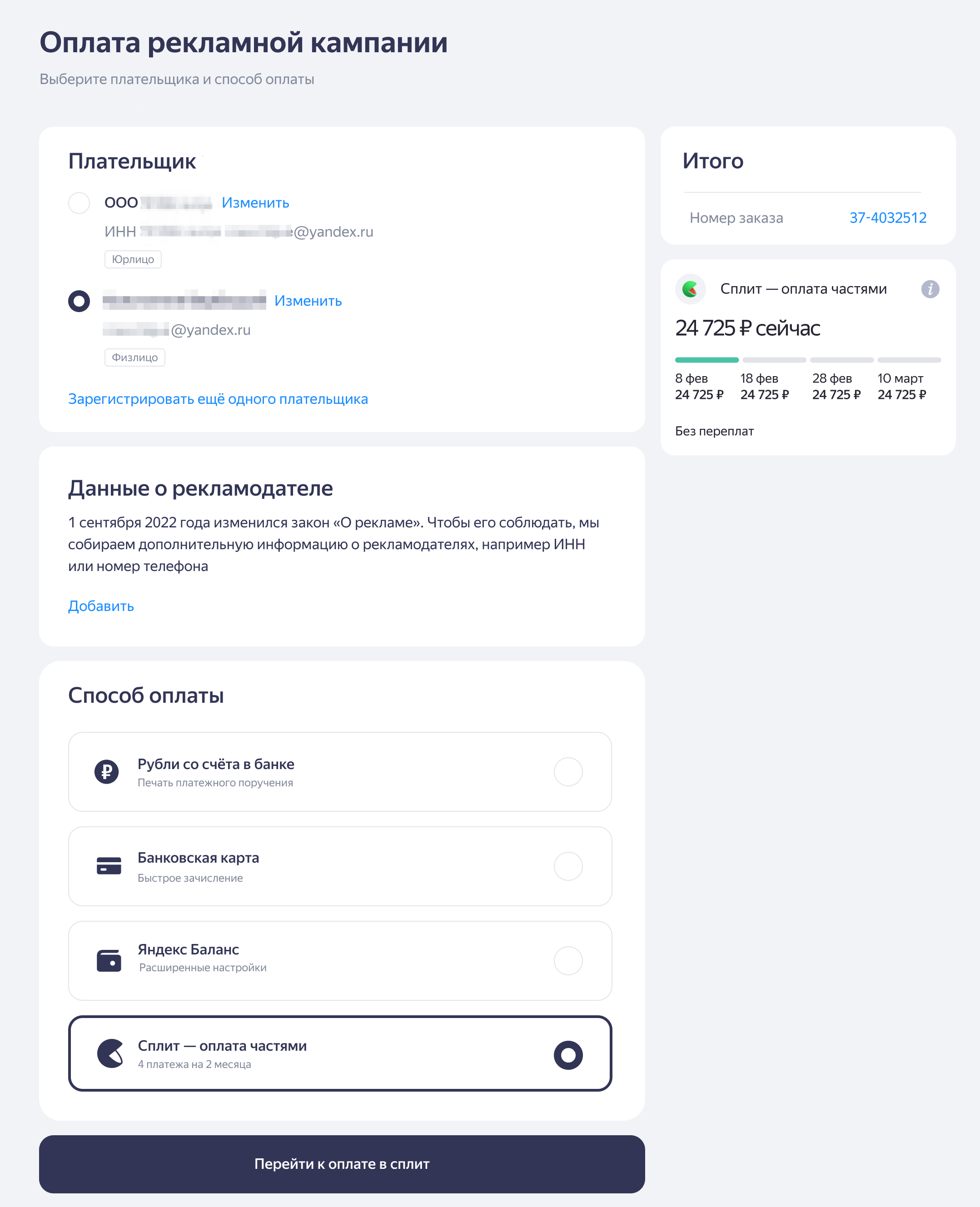 - Только Владелец рекламной кампании может узнать, доступна ли оплата в Сплит.