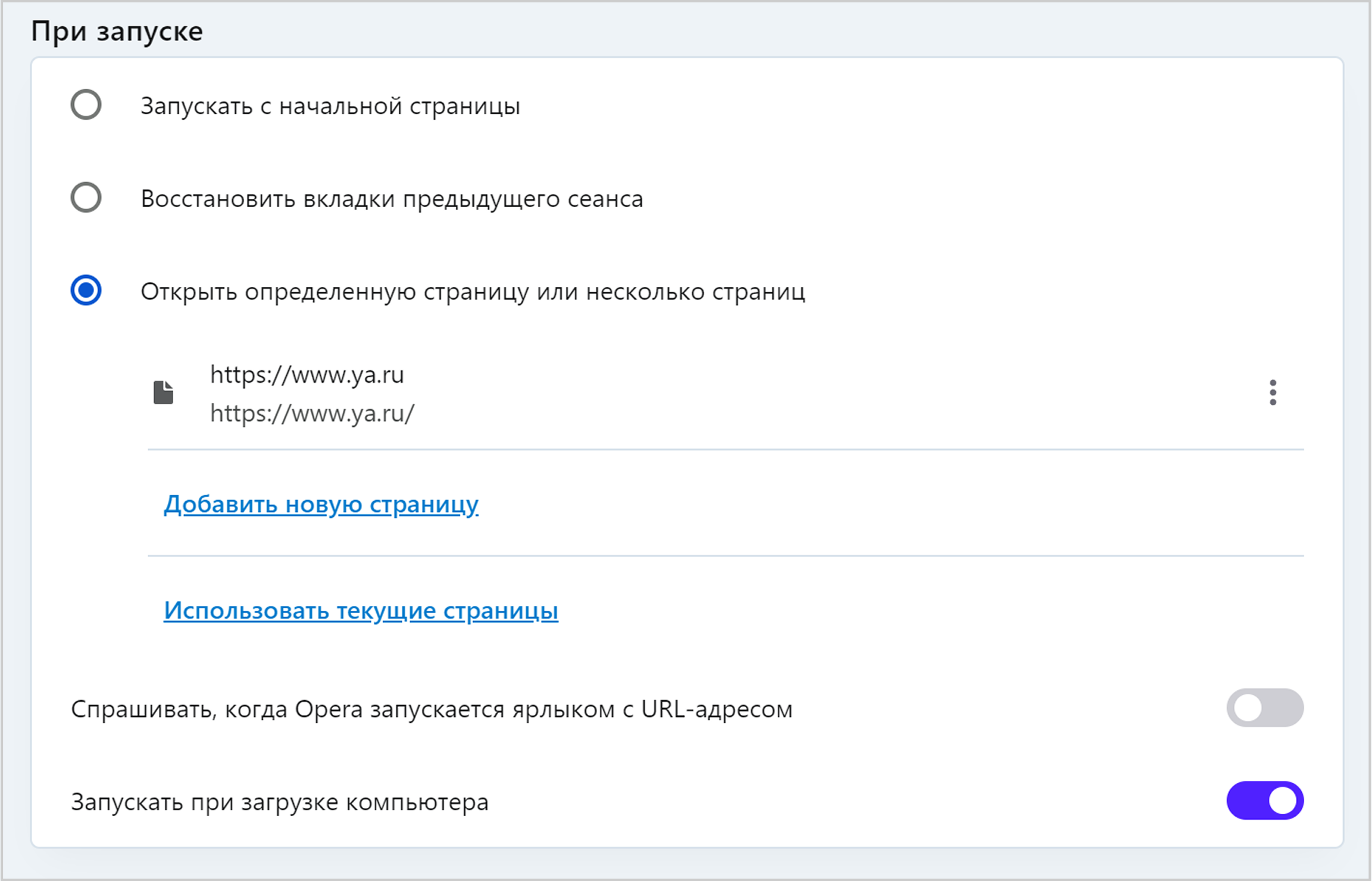 2. В блоке При запуске выберите пункт Открыть определенную страницу или несколько страниц → Добавить новую страницу.
