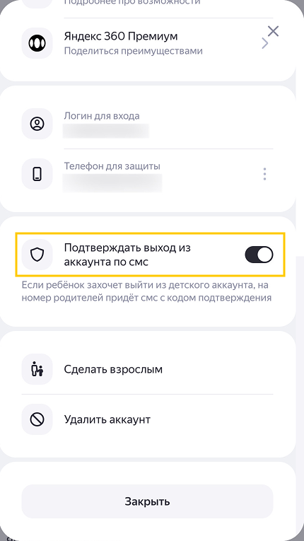 В окне Детский аккаунт включите опцию Подтверждать выход из аккаунта по смс.