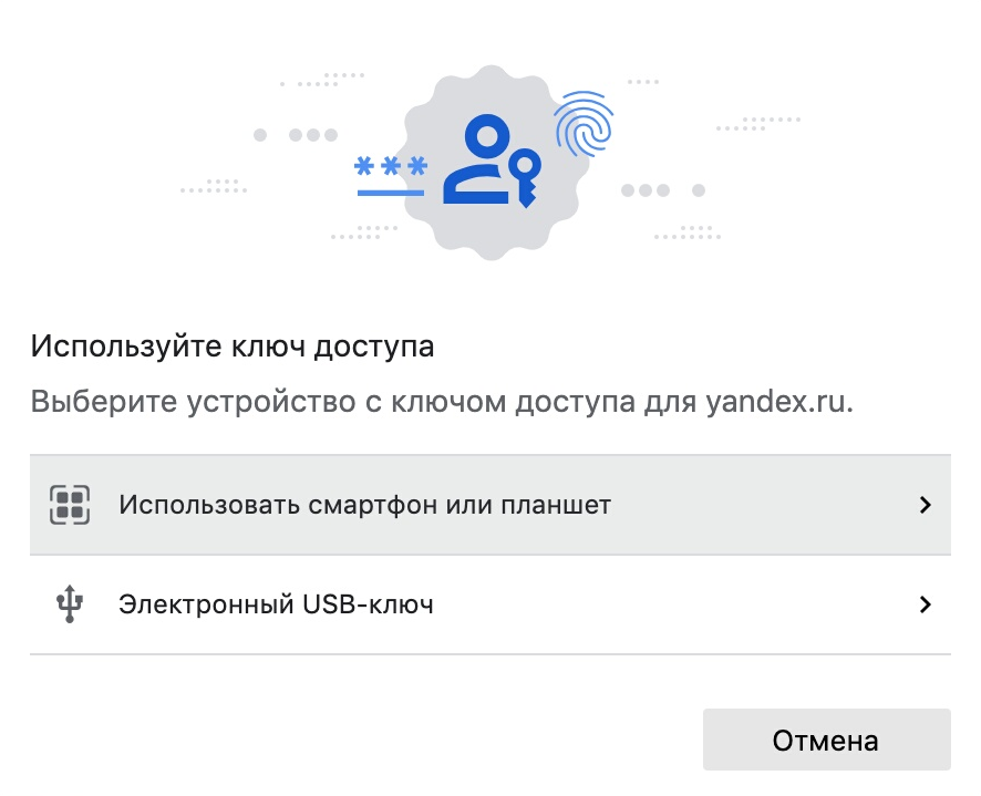 Настраивая устройство, вы добавляете ключ доступа в Яндекс для конкретного браузера. Если вы хотите использовать такой способ входа на других устройствах, после завершения подключения добавьте настроенный ключ доступа на каждое устройство.