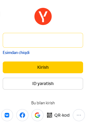 Siz Yandex ID hisobingizni registratsiya qilgan loginni kiriting va Kirish tugmasini bosing.