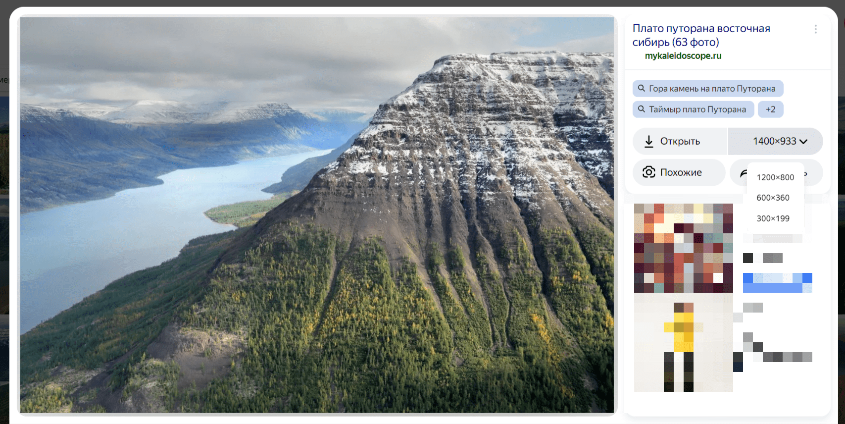 В результатах поиска нажмите на картинку, чтобы развернуть ее. Если не установлен фильтр по размерам, по умолчанию показан самый большой размер. В выпадающем списке справа от раскрытой картинки находятся ссылки на копии изображения в других размерах. Верхняя копия — всегда самая большая. Перейдите по ссылке с нужным размером.