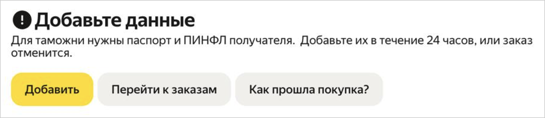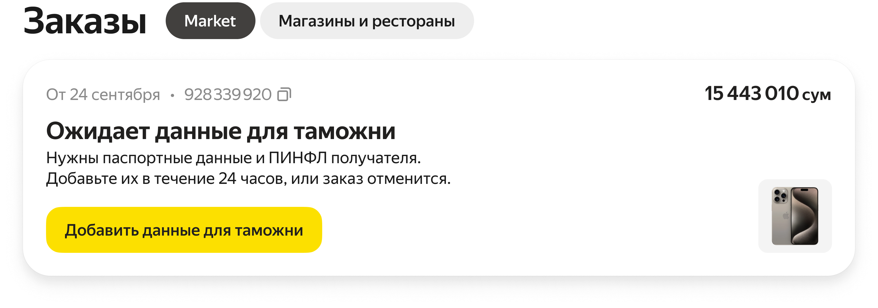 Если вы не передадите Маркету эти данные в течение 24 часов после оформления заказа, заказ будет отменен.