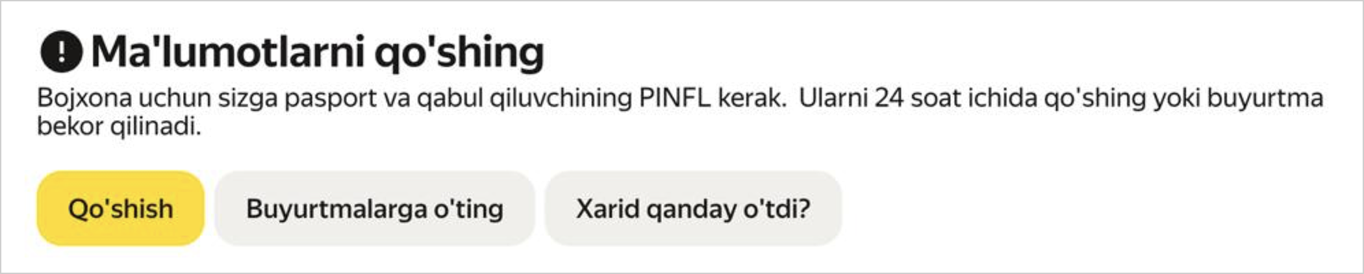 Buyurtmani rasmiylashtirishda va bojxona ma’lumotlarini to‘ldirishda buyurtmani oladigan shaxsning haqiqiy ma’lumotlarini ko‘rsating. Aks holda buyurtma bojxona nazoratidan o‘tmaydi va bekor qilinadi.