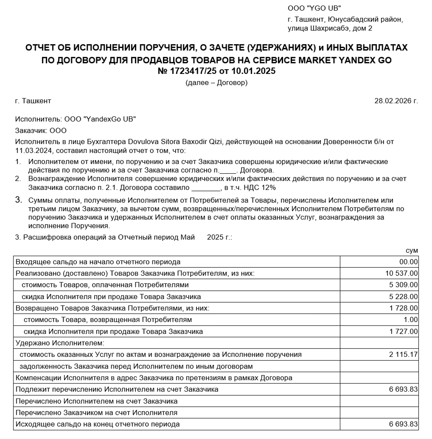 Отчет об исполнении поручения, о зачете (удержаниях) и иных выплатах
