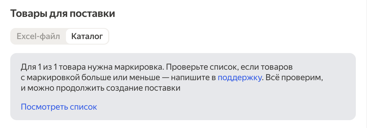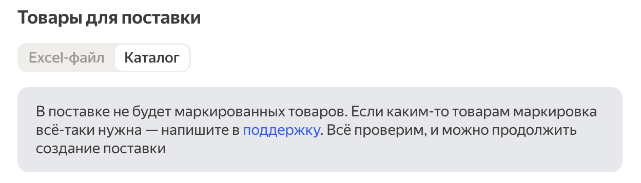 Начните создавать поставку как обычно. Market Yandex Go покажет, есть ли в ней товары с маркировкой.