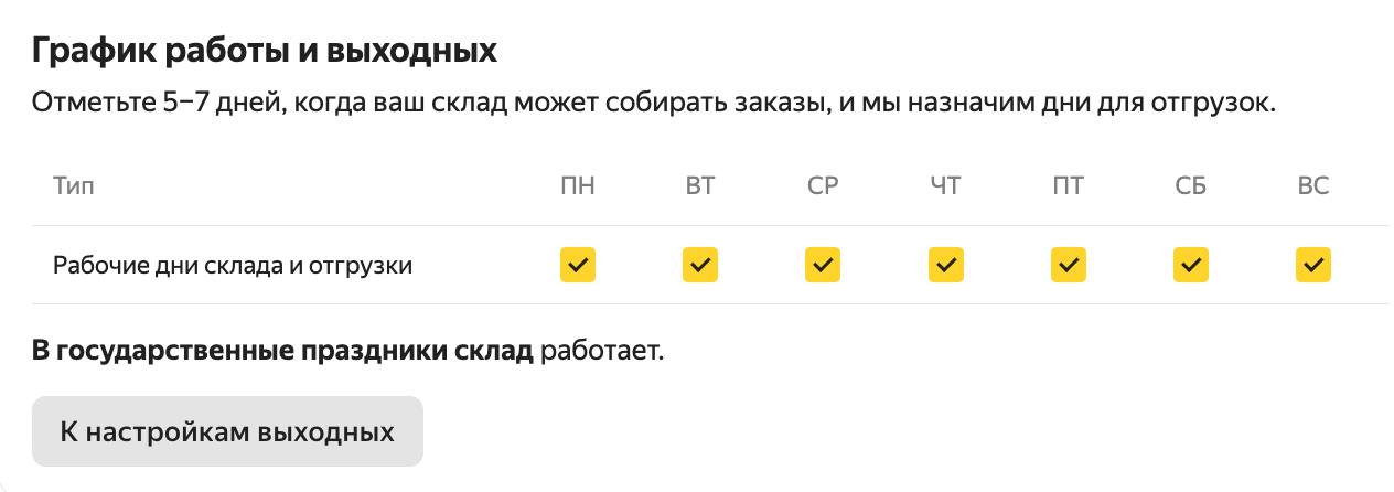 Buyurtmalarni jo‘natish muddatini belgilashingiz mumkin: darhol jo‘natma shakllangan kunni yoki buyurtma qabul qilingan kundan keyingi kunni belgilash imkoni bor. Agar sizga odatda yukni tayyorlash uchun ko‘proq vaqt kerak bo‘lsa, Market Yandex Go yordam xizmatiga murojaat qiling.