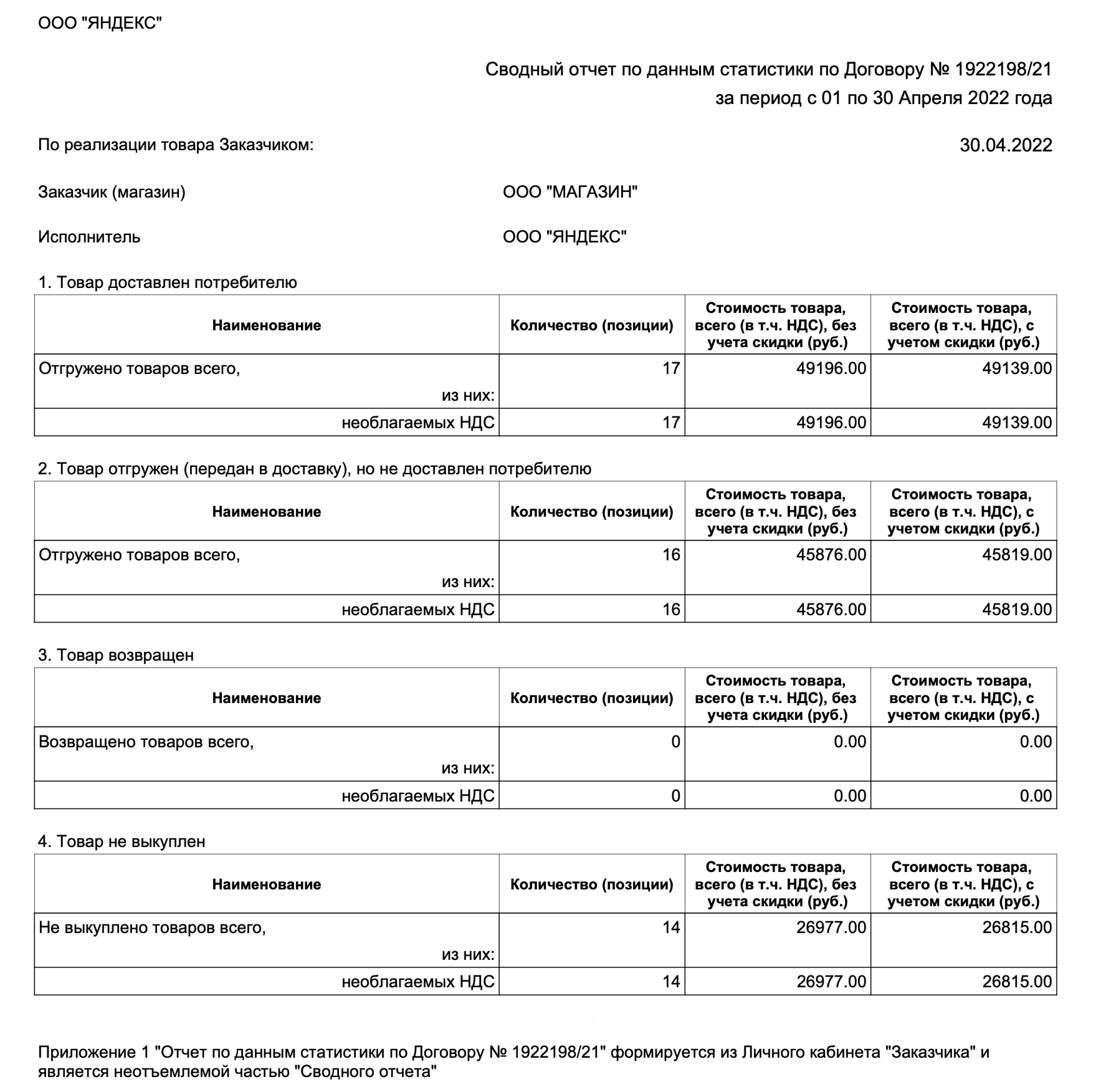 Отчет показывает, сколько ваших товаров и на какую сумму передали в доставку, доставили покупателям, не выкупили и вернули за месяц. На отдельных листах вы найдете списки этих товаров.