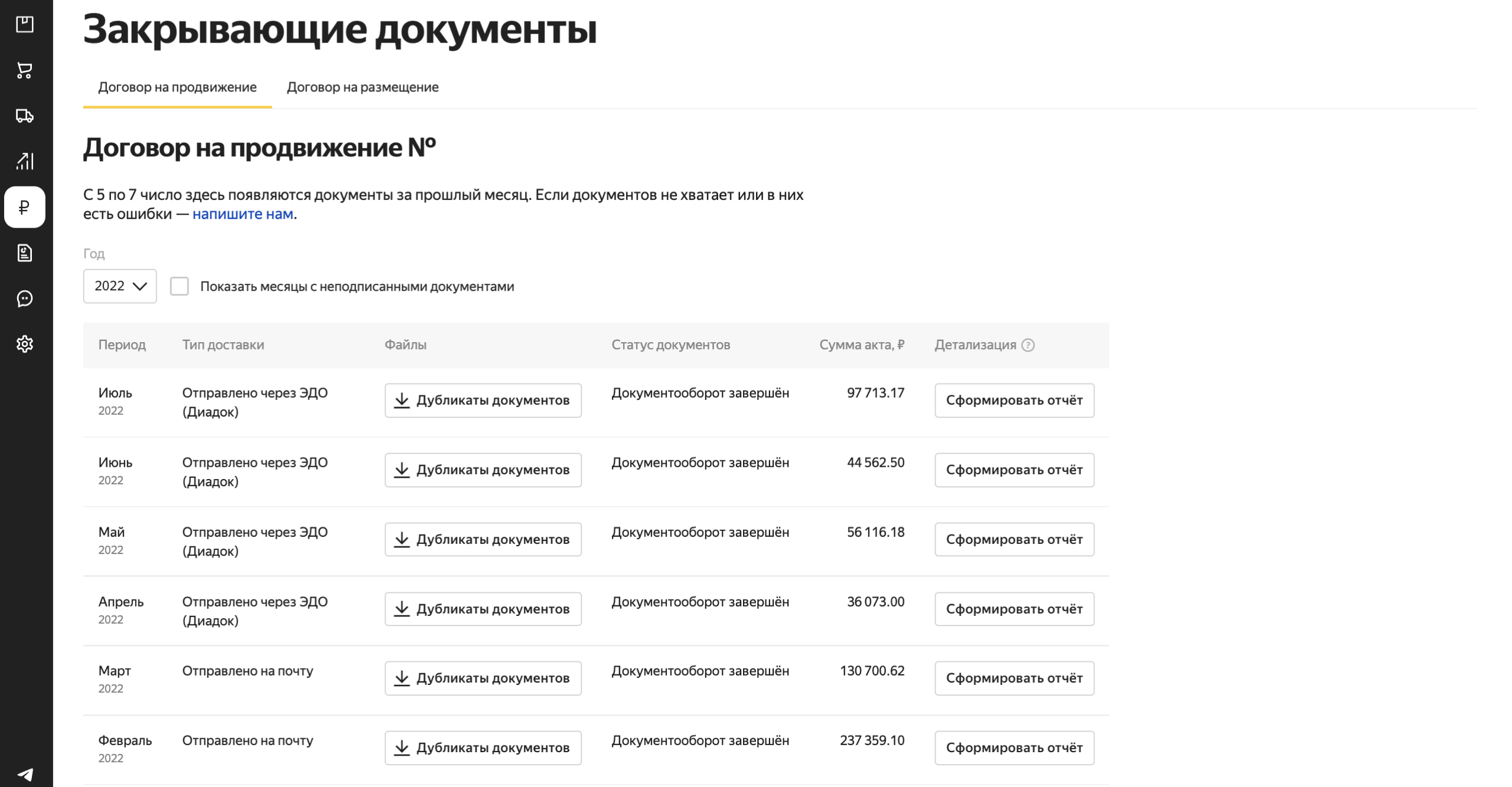 Если вы работаете по общей схеме налогообложения, вам необходимо ежемесячно подписывать и высылать Маркету закрывающие документы. Если этого не делать, Маркет не сможет переводить вам деньги по договору на продвижение.