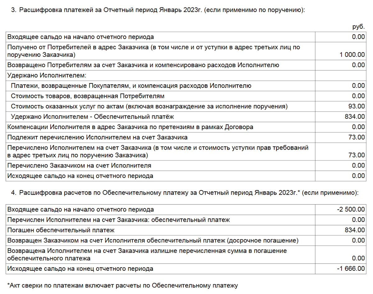 Для погашения обеспечительного платежа Маркет каждый месяц удерживает нужную сумму из платежей покупателей и перечисляет вам разницу. Посмотреть, какая сумма удержана, можно в отчете агента в 3 пункте — строка Удержано Исполнителем — Обеспечительный платеж.