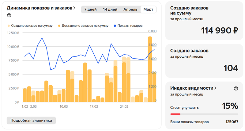 В кабинете доступна подробная статистика ваших магазинов: сведения о заказах, индексе качества, стоимости услуг Маркета и так далее.