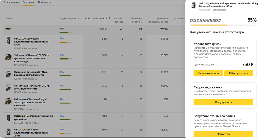 Если у товара низкие показы, сделайте ваше предложение заметнее для покупателей: помогут советы по улучшению Индекса видимости. Чтобы посмотреть их, нажмите на значение в соответствующем столбце. Подробнее — в разделе Продвижение товаров.