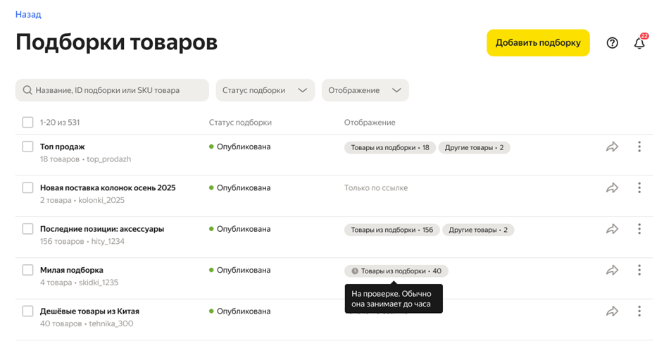После настройки подборка отправится на модерацию. В зависимости от результатов для нее могут отображаться такие статусы: