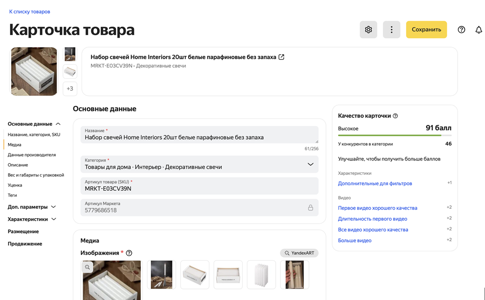 Количество баллов за другие данные может меняться — например, за Ключевые характеристики Маркет начисляет до 12 баллов. При этом количество характеристик, которые необходимо заполнить для максимального балла, зависит от категории.