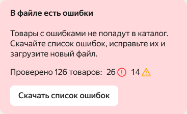 Маркет запустит техническую проверку файла — на этом этапе проверяется, все ли обязательные поля заполнены, везде ли данные в нужном формате, не изменена ли структура файла. Если в файле есть ошибки или недочеты, Маркет предложит скачать их список.