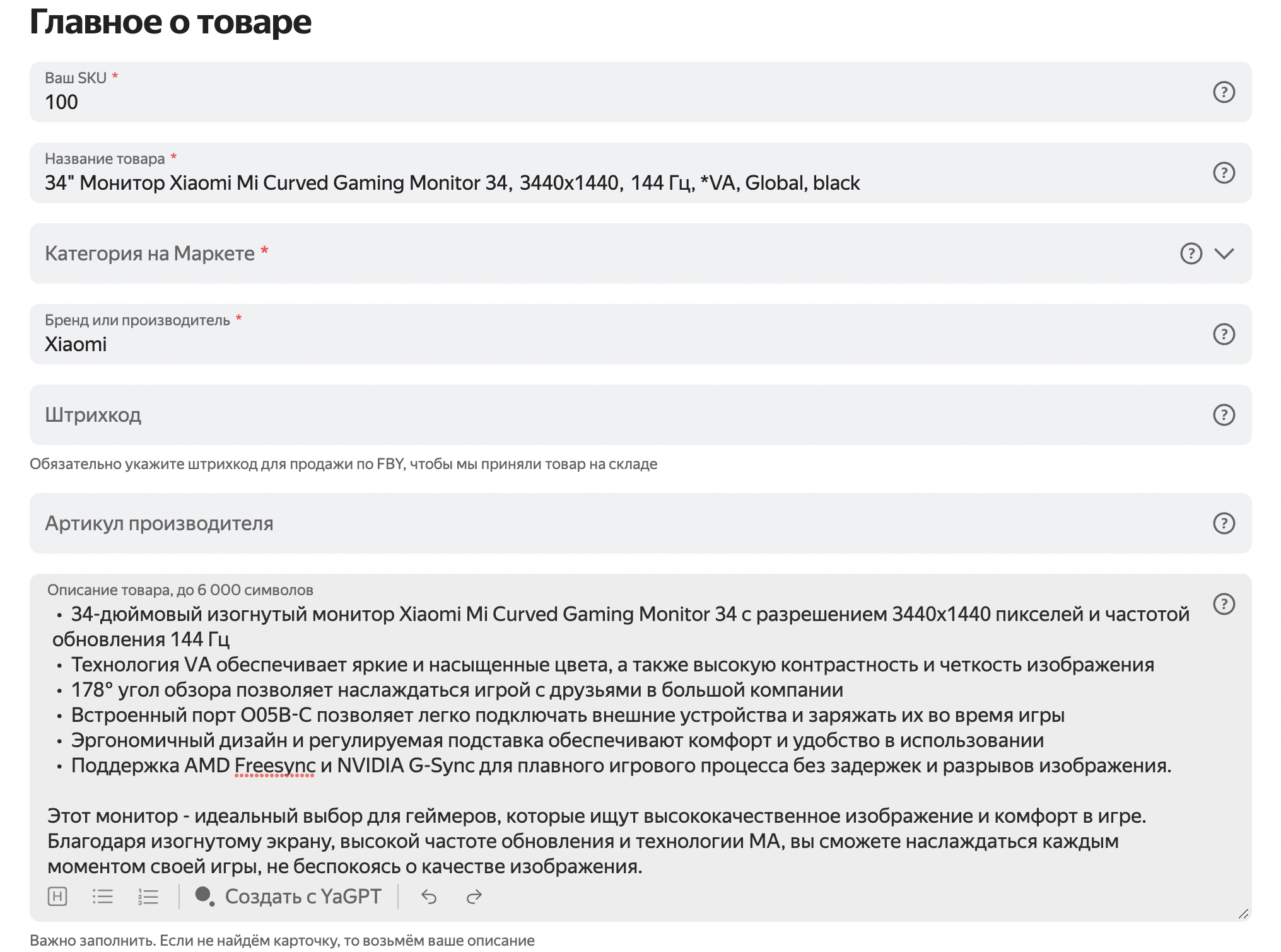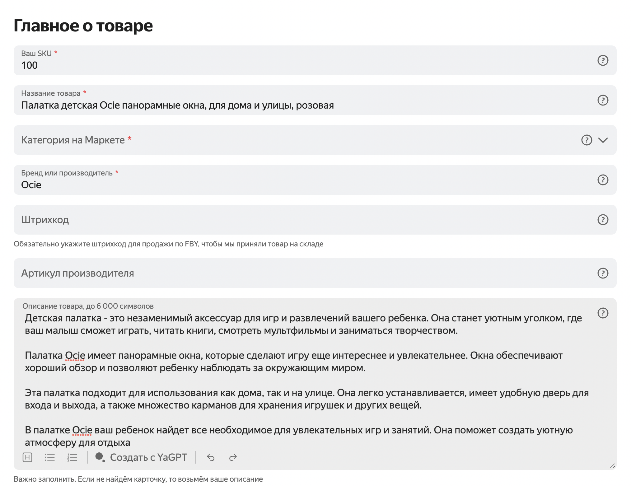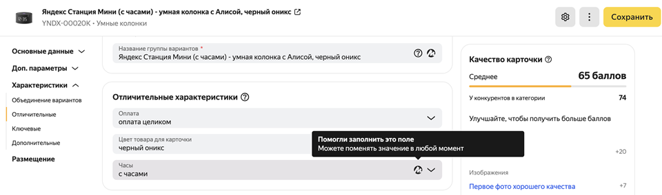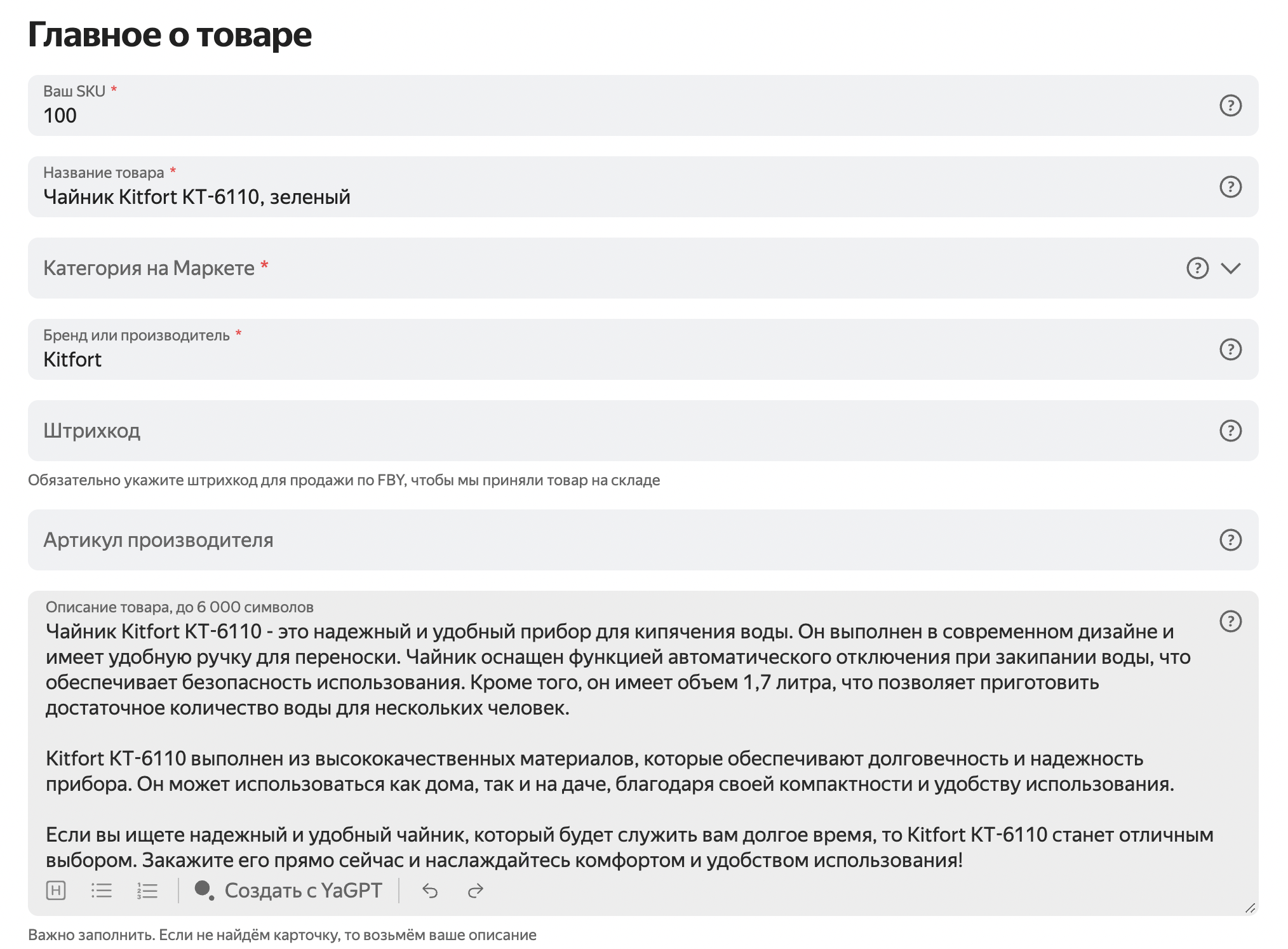 Маркет может помочь с заполнением карточек, если вы разрешите. Если каких-то данных на карточке не хватает, с помощью инструментов искусственного интеллекта они подставятся автоматически. Например, в описании вы указали цвет товара, но поле Цвет в карточке не заполнили и оставили пустым — после проверки карточки Маркетом информация появится в нем автоматически, вместе со специальной отметкой.