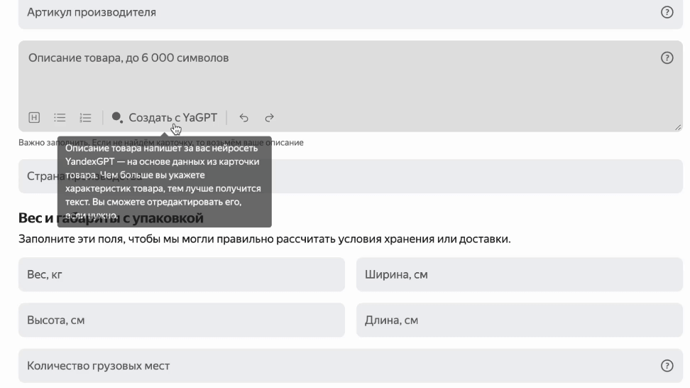 Воспользоваться помощью YandexGPT можно в кабинете на странице редактирования товара: в поле Описание товара нажмите Создать с YaGPT. Чтобы сгенерировать описания сразу для нескольких товаров — отметьте их в каталоге и нажмите Создать описания с YaGPT. Если товаров много — понадобится немного подождать.