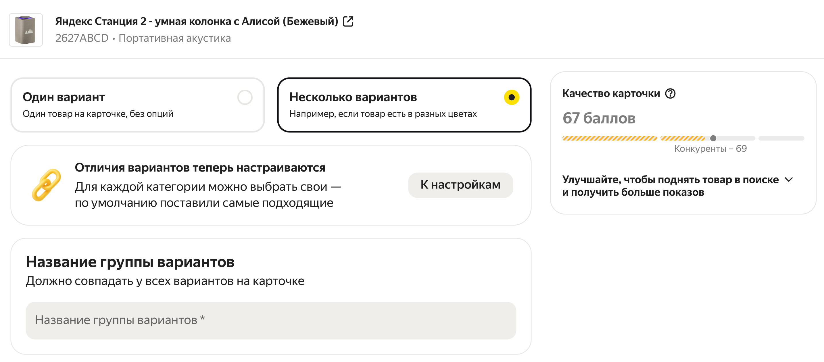 Варианты — это несколько версий одного товара, различающихся по определенным признакам — например, цветом или размером. Объединяйте варианты на одной карточке, чтобы покупатель видел все версии на одной странице и мог быстро переключаться между ними.