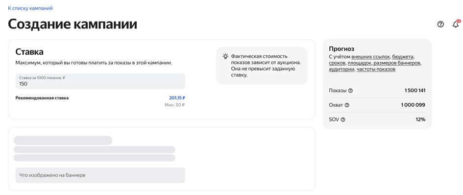 Во время настройки прогноз показывает возможные итоги кампании с заданными параметрами. Если вы меняете настройки — увеличиваете бюджет, добавляете новые регионы — данные в прогнозе также автоматически обновляются. Это поможет до запуска скорректировать кампанию для достижения целей и спланировать расходы на продвижение.