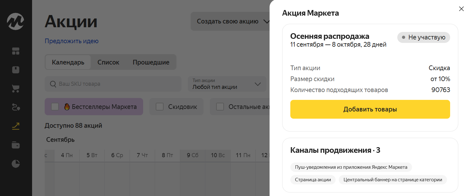 Нажмите на акцию в календаре, а затем — Добавить товары.
