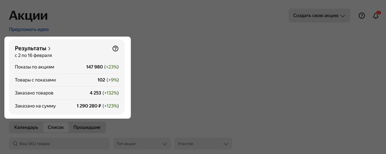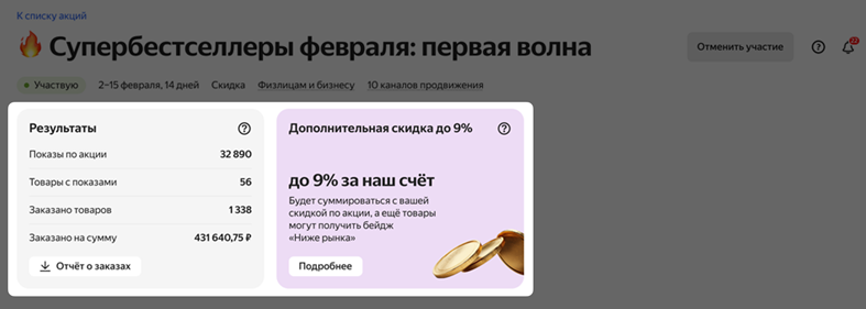 • Для отдельной акции — перейдите в раздел Акции, а затем в нужную акцию через календарь или список. Маркет покажет виджет с результатами участия с даты начала акции.