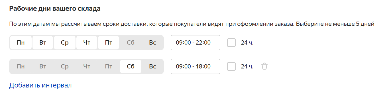 Рабочие дни обозначены белым, выходные — серым. Нажимайте на дни, чтобы менять их статусы. Справа задайте часы работы. Если в разные дни часы работы разные, нажмите Добавить интервал. Появится еще одна строчка, для которой можно отдельно задать время. Например, склад на картинке по будням работает с утра до вечера, по субботам до шести, а в воскресенье закрыт: