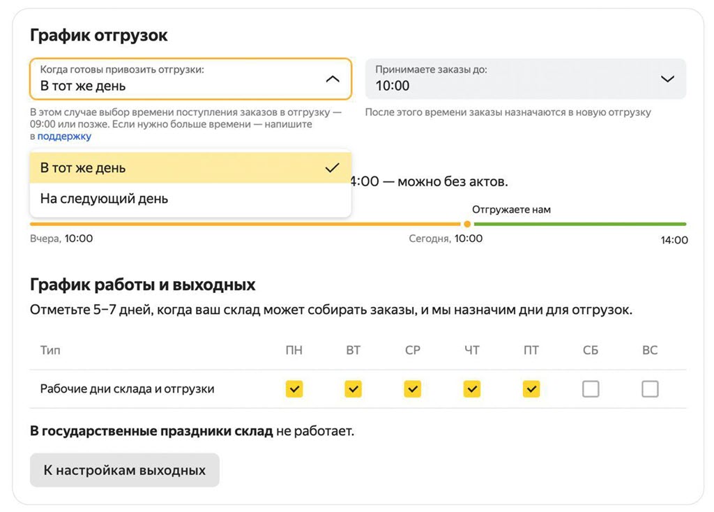 График работы склада — дни, когда вы можете обрабатывать и отгружать заказы.